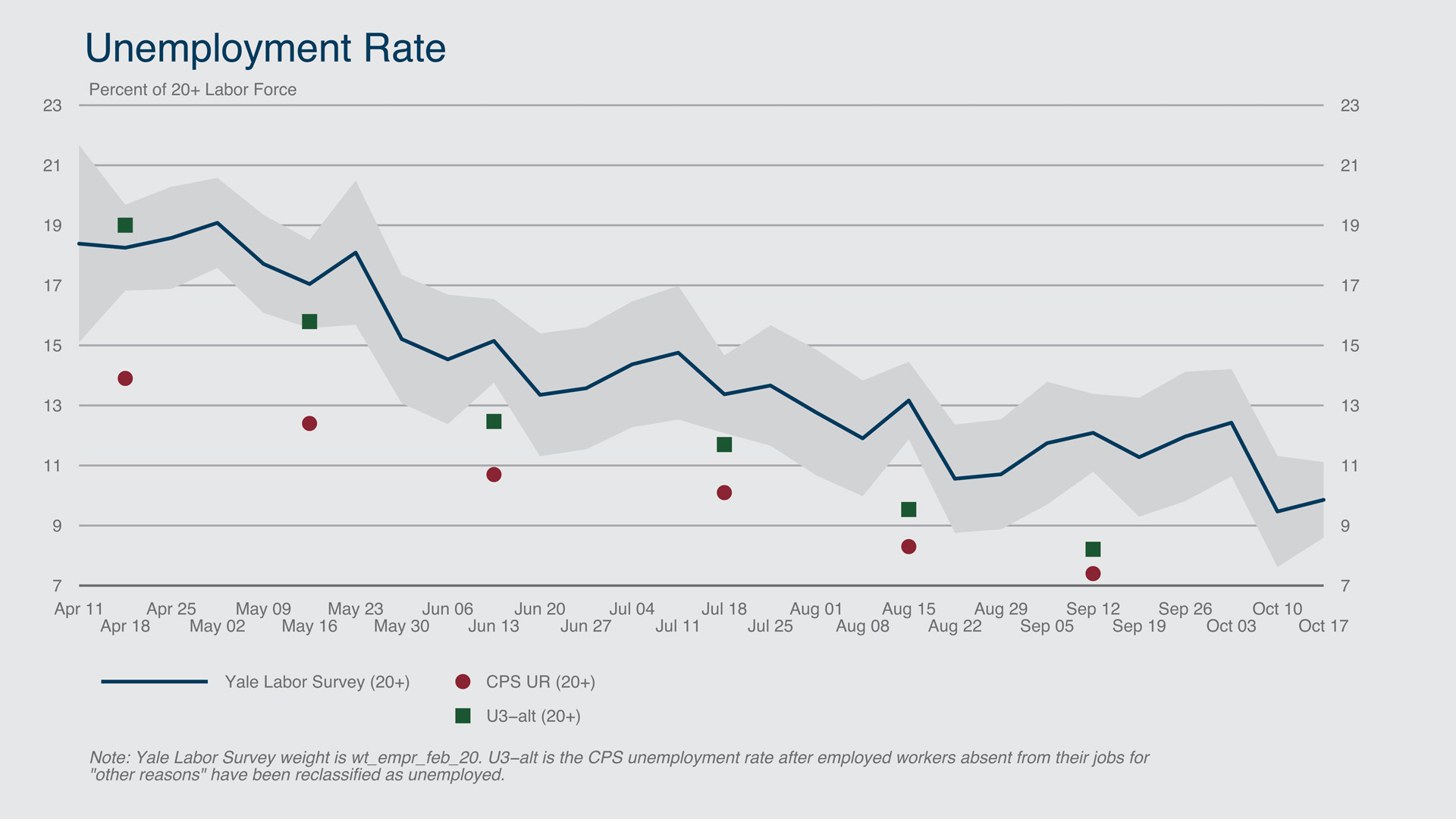 Despite the differences, basic trends in CPS and YLS unemployment-rate estimates have been similar through most of the sample period. Unemployment fell significantly from April through June, consistent with the significant increase in employment that both surveys measure. For the week ending October 17, the YLS UR was 9.9%, up 0.4 percentage point from the previous week and down 2.2 percentage points from the September CPS reference week. During that week, a CPS unemployment rate corrected for classification errors (“U3-alt”) was 8.2%.