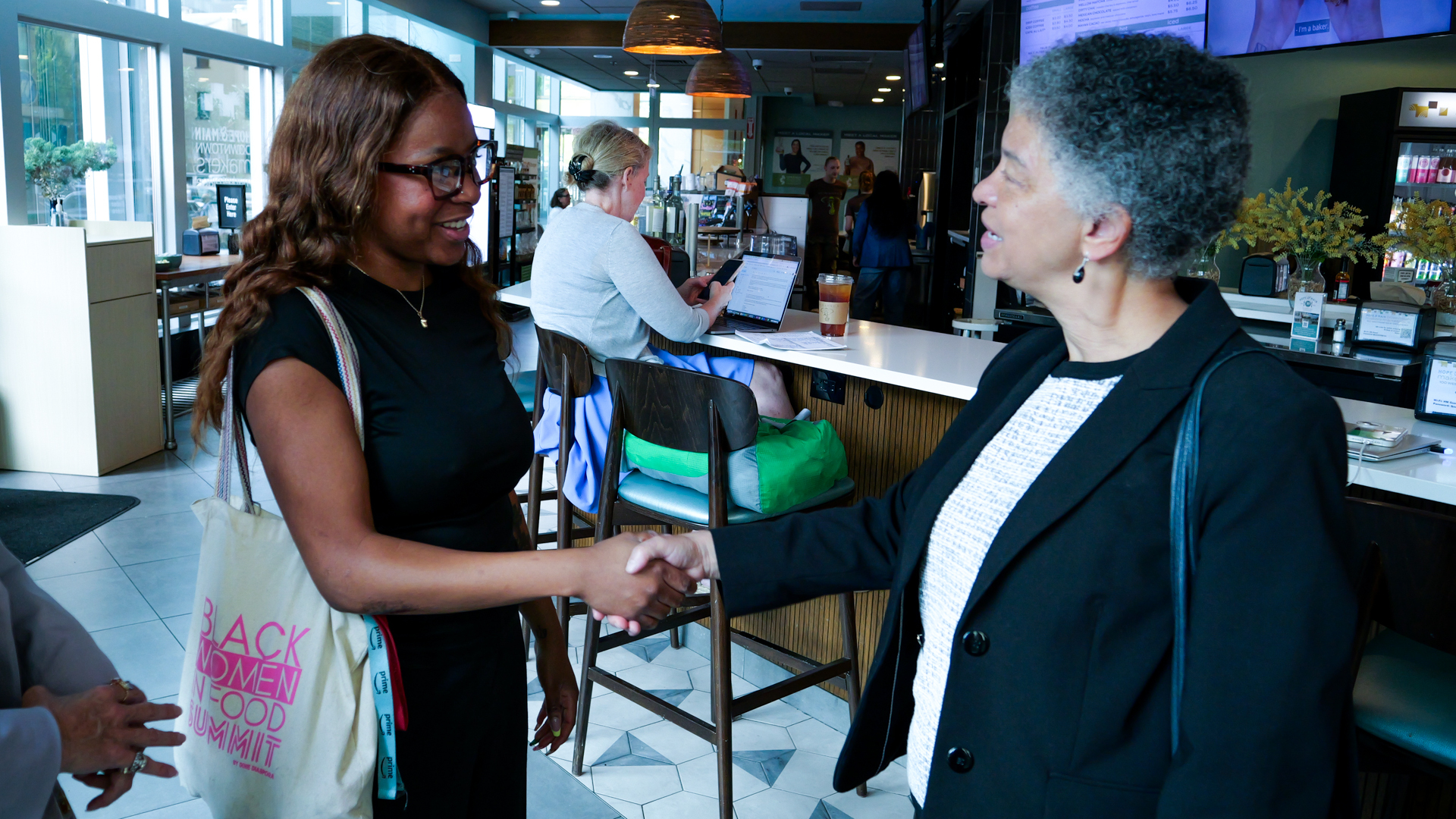 Savannah Campbell, founder of Caribe & Co, which makes syrups infused with Caribbean flavors, shakes hands with Collins at Hope & Main. Steve Osemwenkhae/Federal Reserve Bank of Boston