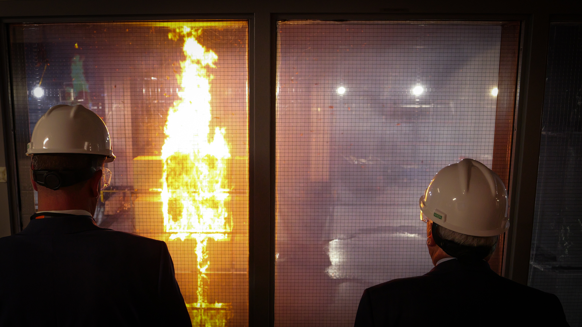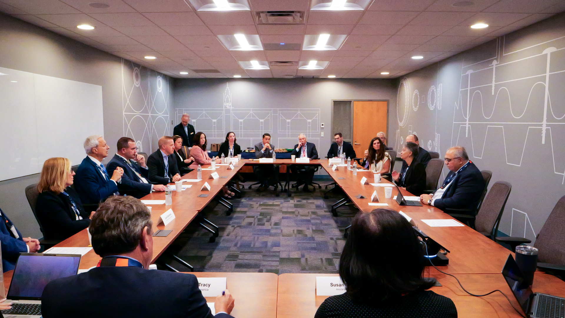Boston Fed President and CEO Susan Collins speaks with Louis Gritzo, FM's chief science officer, and Sanjay Chawla, the Rhode Island firm's chief investment officer. FM hosted a roundtable discussion Oct. 7 between Collins and state business leaders about regional economic conditions. Steve Osemwenkhae/Federal Reserve Bank of Boston