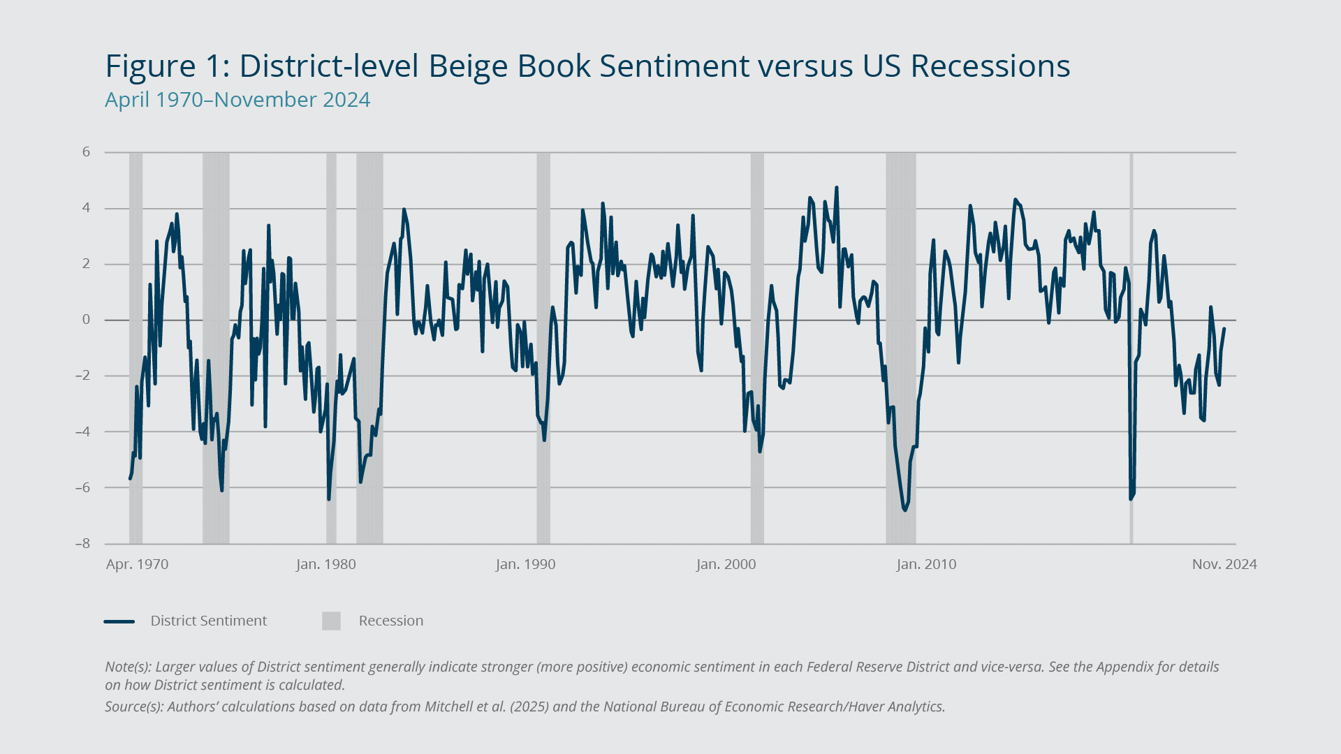 We calculate the sentiment value for each of the 12 Federal Reserve Districts for each roughly six-week cycle covered by the Beige Book reports released during the 1970–2025 period. The District sentiment value summarizes all 12 District-level sentiment values at any given time during that period. The Appendix includes details about how we calculate the District sentiment value.