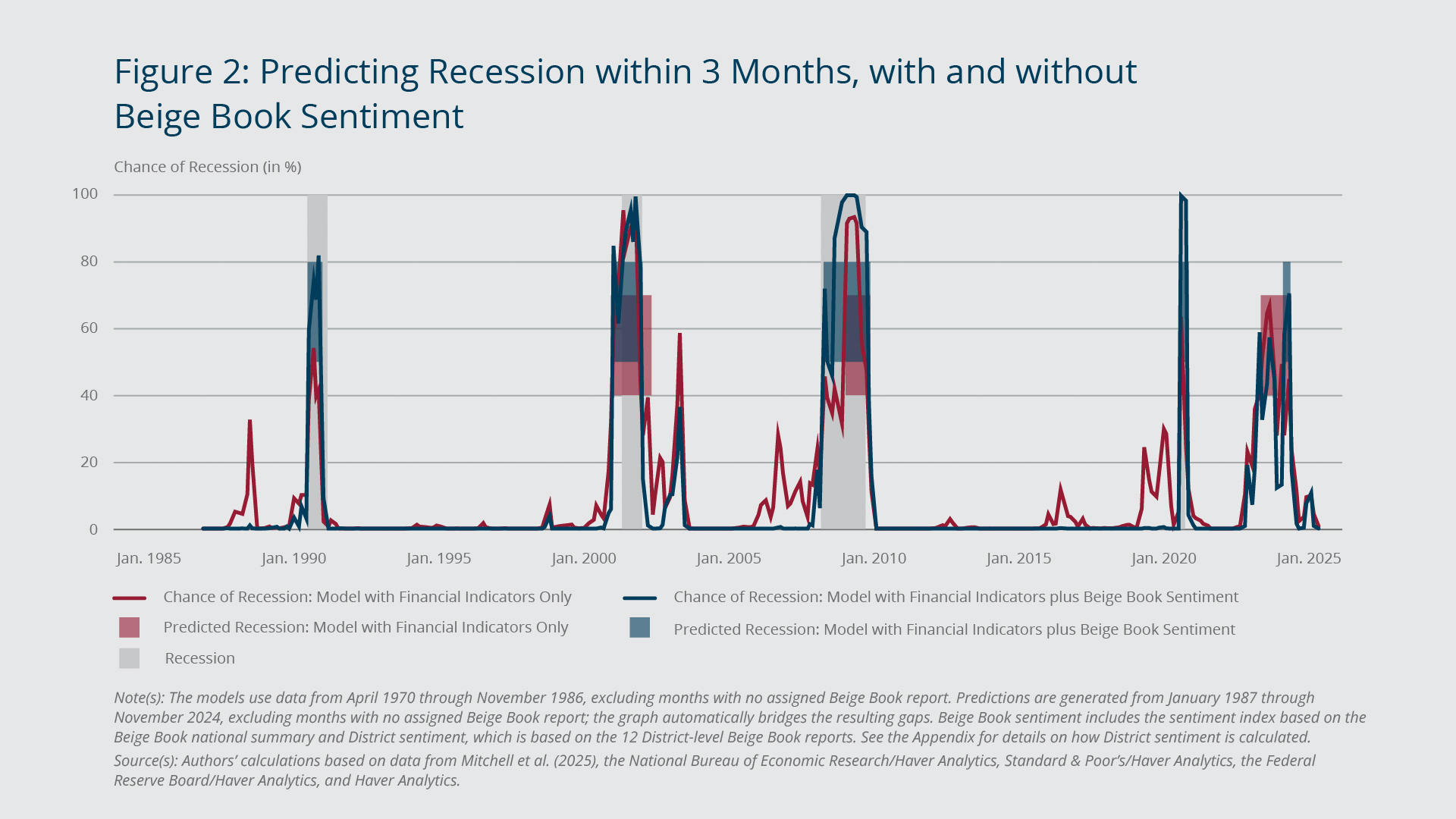 Our study is the first to test whether the Beige Book adds value over established financial indicators for predicting recessions. We find that incorporating Beige Book–derived sentiment measures into an established model that uses the term spread, the lagged term spread (the term spread from an earlier point in time), and the S&P 500 index to forecast recession risk over a three-month horizon—that is, within the three months following the forecast—improves the model’s performance.
