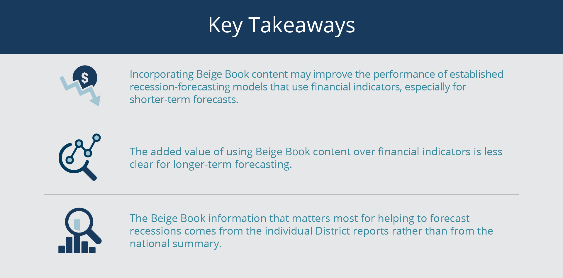 We find that incorporating Beige Book content—specifically, quantitative sentiment indexes based on Beige Book texts—may improve the performance of established recession-forecasting models that use financial indicators. This finding applies especially for shorter-term forecasts. However, the added value of using Beige Book sentiment indexes over financial indicators is less clear for longer-term forecasting. We also find that the Beige Book information that matters most for helping to forecast recessions comes from the individual District reports rather than from the national summary.