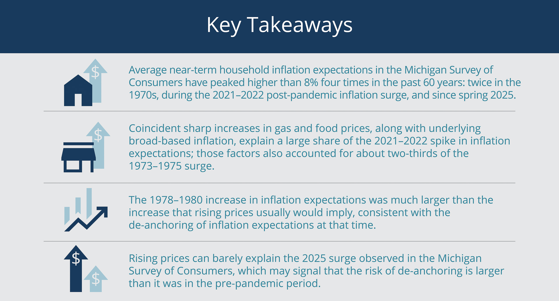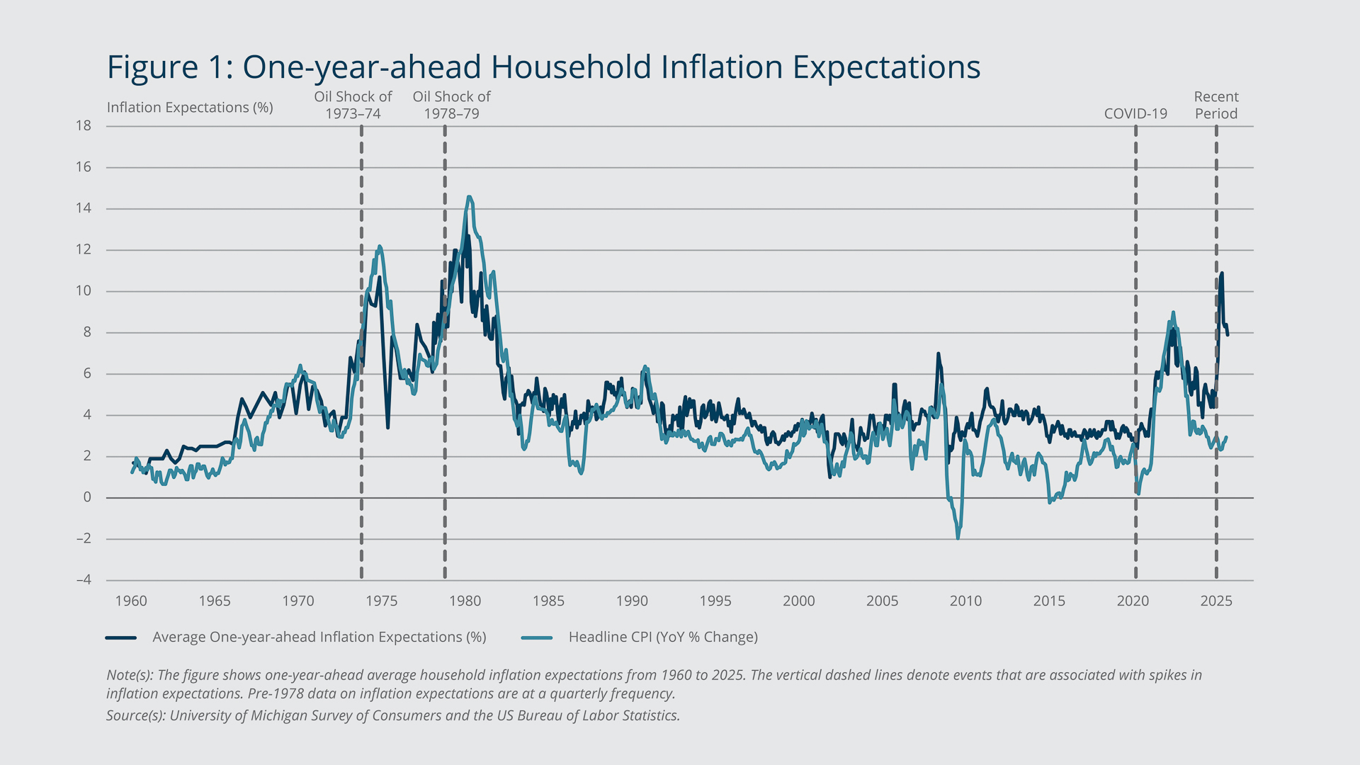 As Figure 1 shows, one-year-ahead average (mean) household inflation expectations have risen above 8 percent in four episodes since 1960. The first two occurred during the Great Inflation of the 1970s, from 1973 to 1975 and from 1978 to 1980. The third was in 2021 and 2022, during the pandemic-induced inflation surge, and the fourth began in March 2025.