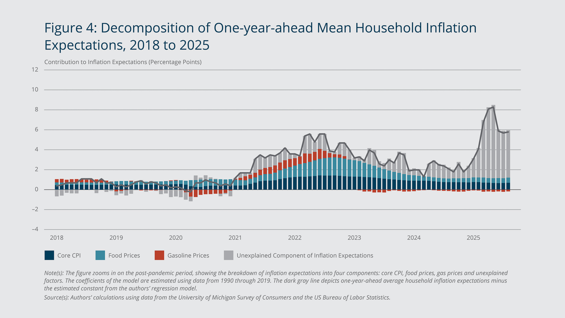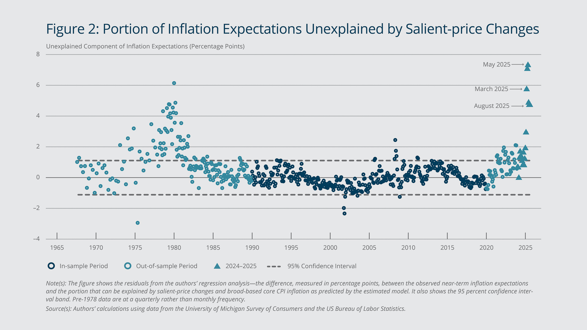 By contrast, starting in March 2025, we see a sudden and large increase in households’ near-term inflation expectations —more than 7.5 percentage points—that is not related to the usual drivers. While that unexplained increase receded notably over the summer, it is still unusually large, as it remains clearly above the 95 percent confidence interval.