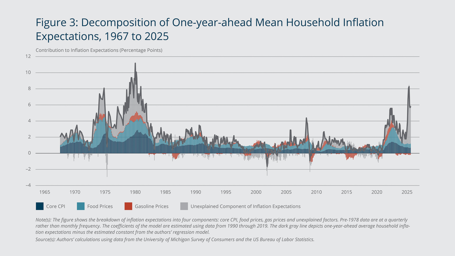 We find that the spikes in inflation expectations in the early 1970s and during the pandemic can be explained to a large degree by the steep increases in gas and food prices and the broad-based inflation that marked those periods. However, our estimates indicate that the late-1970s surge in expectations was not as closely related to price increases, and neither was the surge that began in spring 2025.