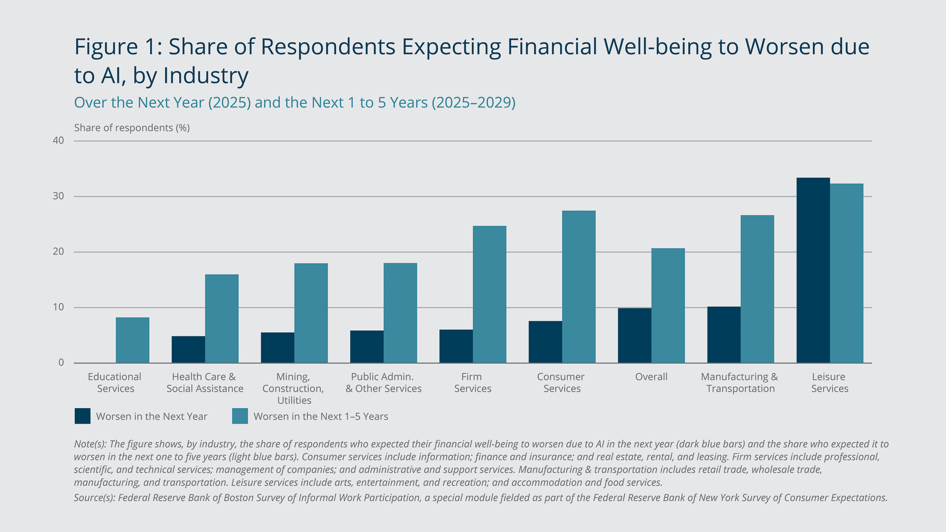 The findings indicate that at the time of the survey, most workers were not immediately worried about AI-driven job loss—which is consistent with an August 2025 New York Fed survey showing that few firms had laid off workers due to AI (Abel et al. 2025). However, about 21 percent of the survey respondents expected that AI would cause their financial situation to worsen within one to five years.