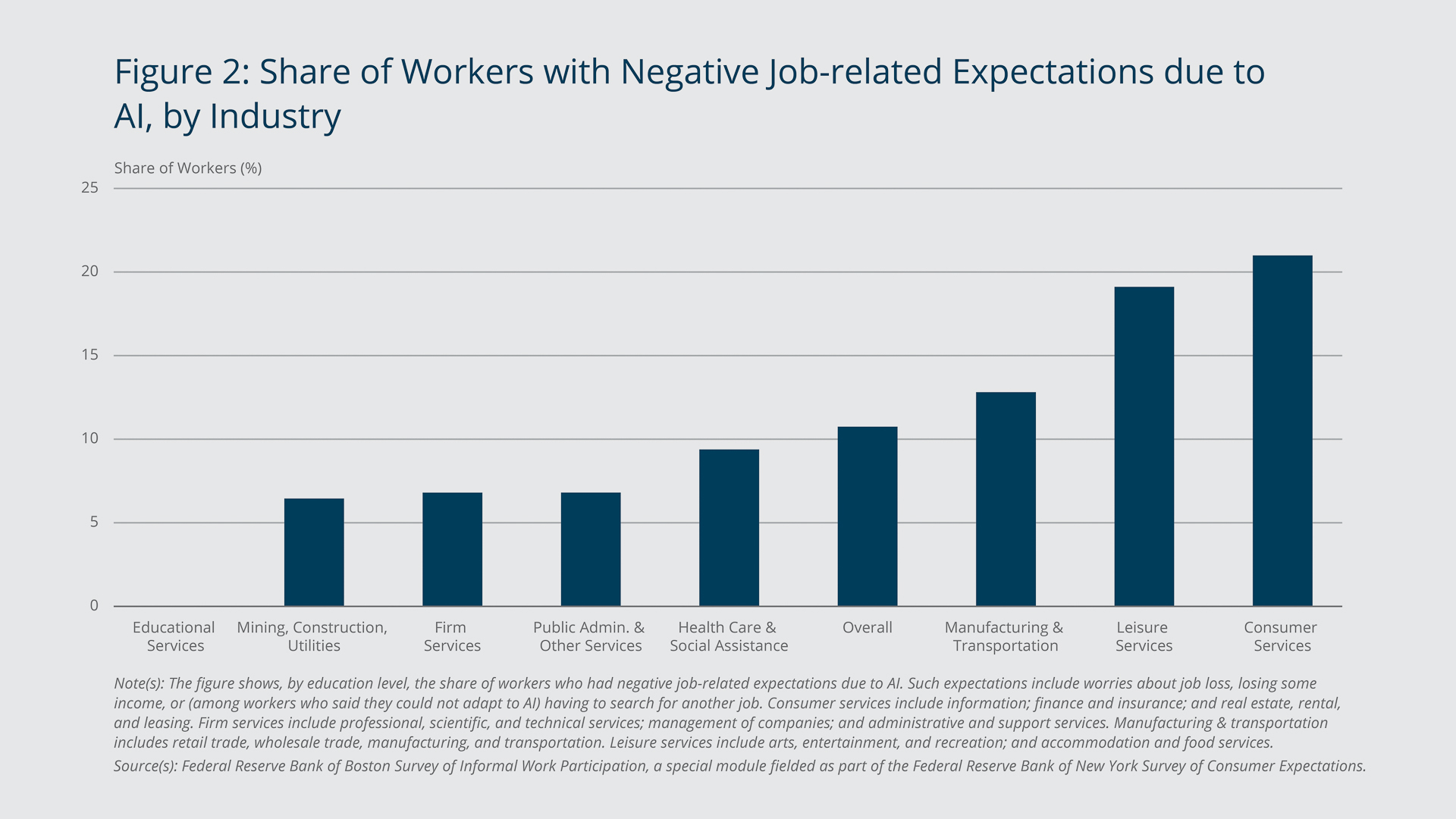 Respondents employed in leisure services (which includes jobs in arts and entertainment as well as in hotels and restaurants) and consumer services (which includes information-services positions such as librarians and cloud computing professionals as well as jobs in finance, insurance, and real estate) were the most worried about their job prospects due to AI.