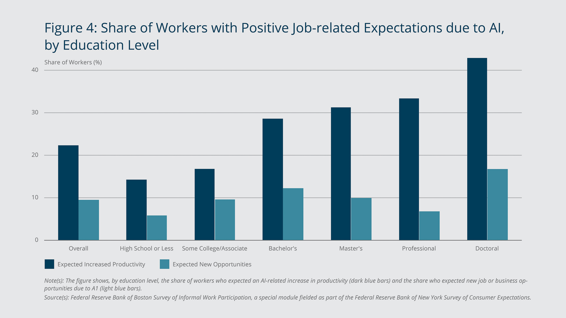 The difference in expectations across education levels highlights the potential importance of targeted skill-development policies, which could help ensure that productivity gains from AI adoption are broadly shared.