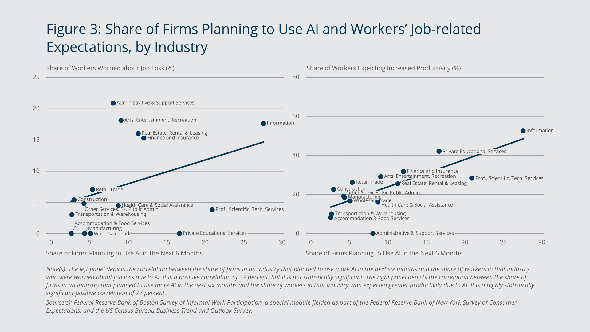 As with pessimism about AI, optimism varied substantially across industries. The shares of workers expecting AI-related productivity boosts were the largest in information (53 percent), private educational services (42 percent), and finance and insurance (32 percent). Expectations of greater productivity are related positively to the share of an industry’s firms that expected to use more AI in the next six months, as recorded in the BTOS at the end of 2024. This relationship is seen in the right panel of Figure 3. The correlation is strong at 77 percent, and it is highly statistically significant.4