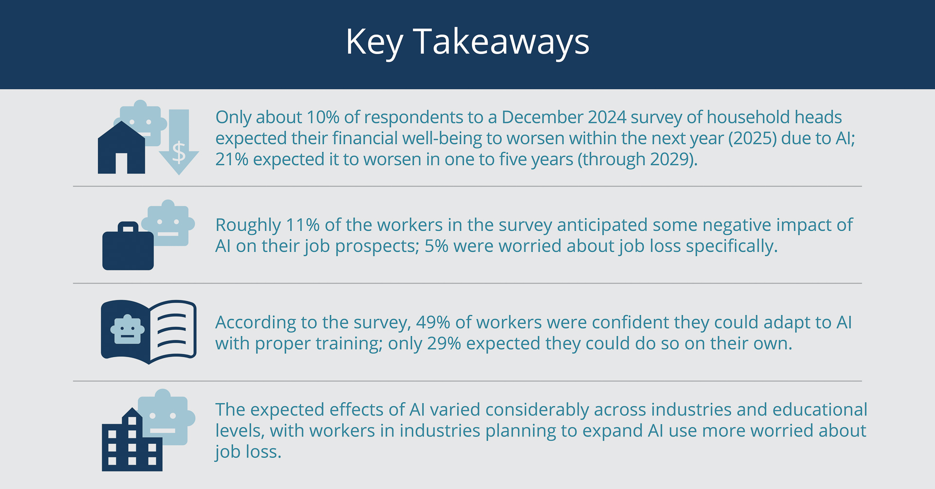 The artificial intelligence (AI) revolution is here and is expected to transform the labor market, creating new opportunities for some workers while eliminating the jobs of others. We surveyed a sample of US household heads working in different industries and with different educational backgrounds to better understand how they view AI and its potential effects on their job prospects and financial well-being.