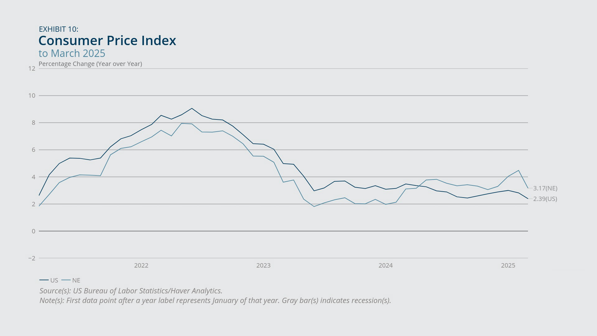 In March 2025, the Consumer Price Index for All Urban Consumers (CPI-U) exhibited year-over-year price growth of 3.2 percent for New England compared with a corresponding inflation rate of 2.4 percent in the United States (Exhibit 10). Both the region and nation experienced a slowdown in the rate of annual inflation relative to such price growth in the previous month. In the region, year-over-year price growth fell by 1.3 percentage points in March 2025 compared with annual growth in February 2025, while in the nation, year-over-year price growth fell by 0.4 percentage point during that period.