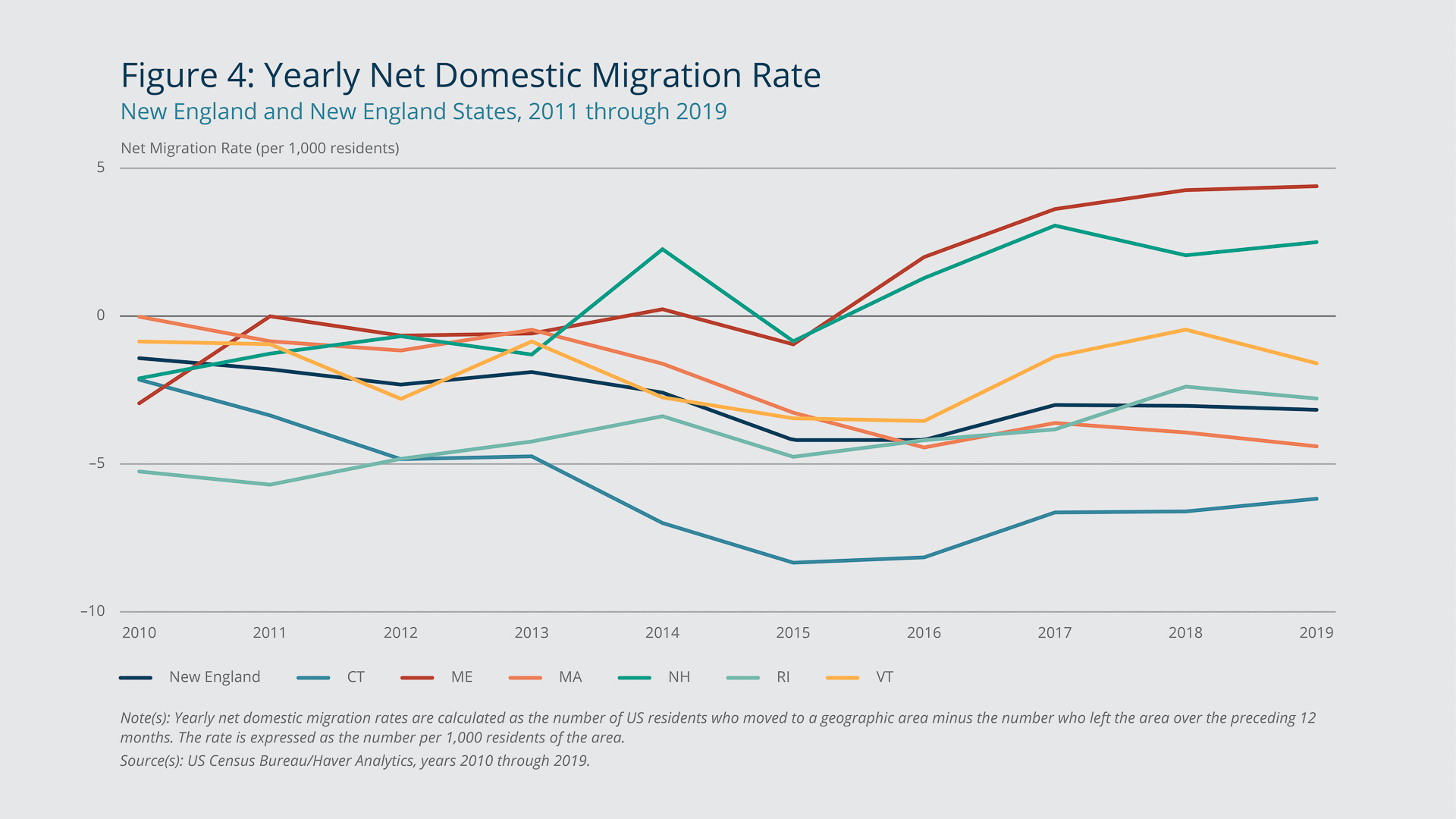 - Over the study period, international migration to New England also went through substantial changes due largely to changes in immigration policies. This brief focuses on domestic migration measures exclusively to highlight the impact of the domestic economic environment on US residents’ residential choices.