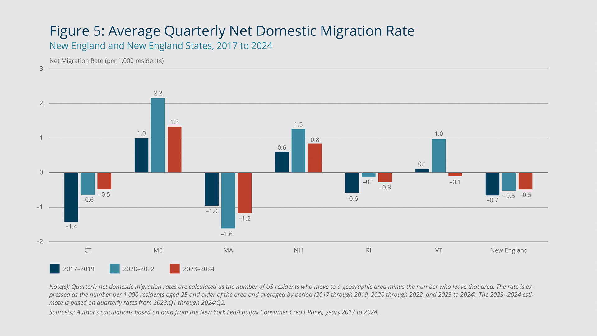 The dynamics of net domestic migration (in-migration minus out-migration) in New England underwent significant changes after the onset of the COVID-19 pandemic, leading to population gains in some of the region’s states and losses in others. However, after the early years of the pandemic, population changes related to the pandemic moderated, and by the 2023:Q1—2024:Q2 period, net domestic migration rates in most of the states had largely returned to their pre-pandemic levels.